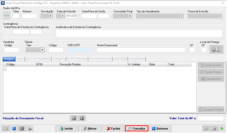 1. Na tela principal do sistema acesse o menu Lançamento > Emissão de Documentos Fiscais > NF-e (Código 55), clique em "Consultar";