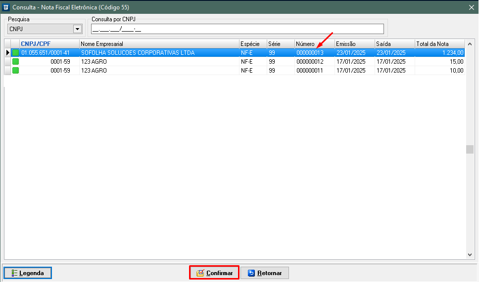 2. Na tela de consulta tecle "Enter" e selecione o documento já Autorizado que deseje Cancelar, confirme a tela;