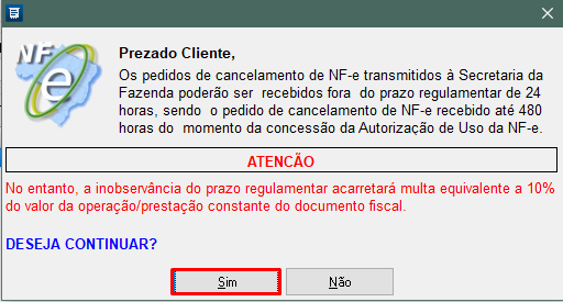 4. Observado as orientações para o cancelamento da Nota Fiscal Eletrônica, clique em "Sim";