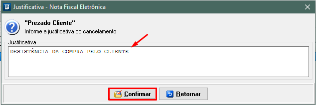 5. Informe a justificativa do cancelamento com no mínimo 15 caracteres conforme exemplo abaixo, confirme a tela;