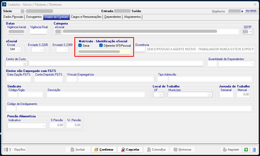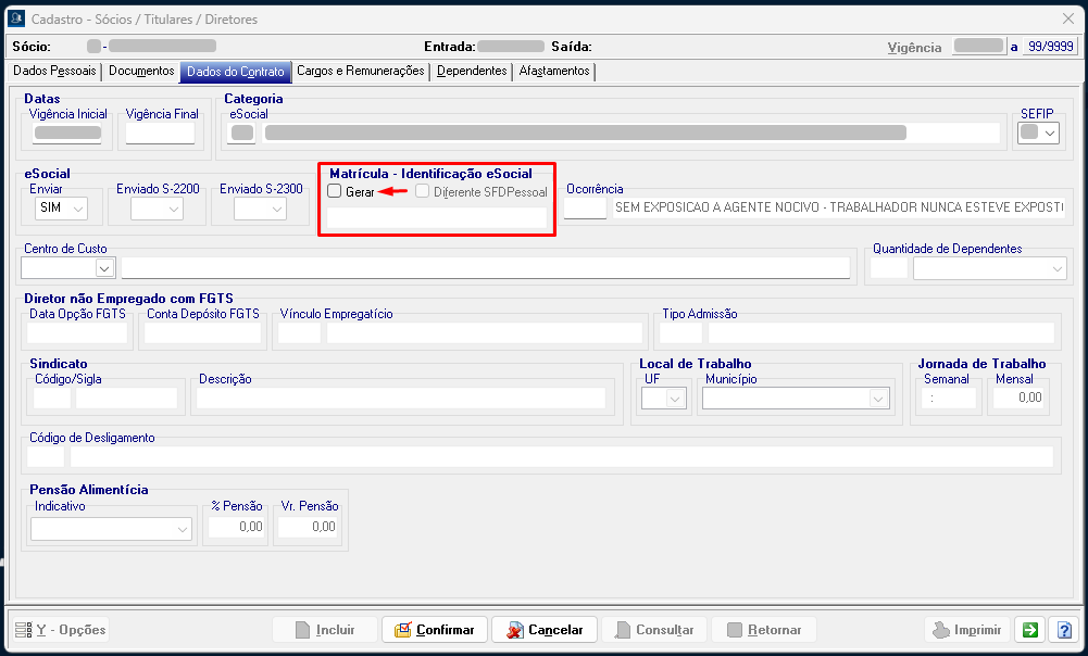 5. No sistema SFDPessoal, acesse o cadastro do trabalhador sem vínculo, selecione a aba Dados do Contrato e desmarque o checkbox "Gerar" na seção Matrícula - Identificação eSocial, caso não exista matrícula no eSocial.