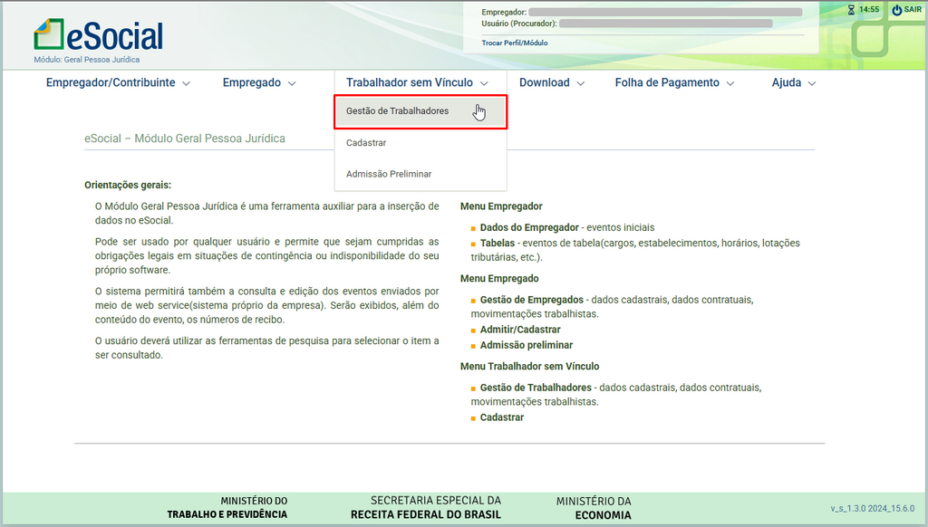1. Acesse o portal do eSocial e navegue até Trabalhador sem vínculo > Gestão de Trabalhadores.
