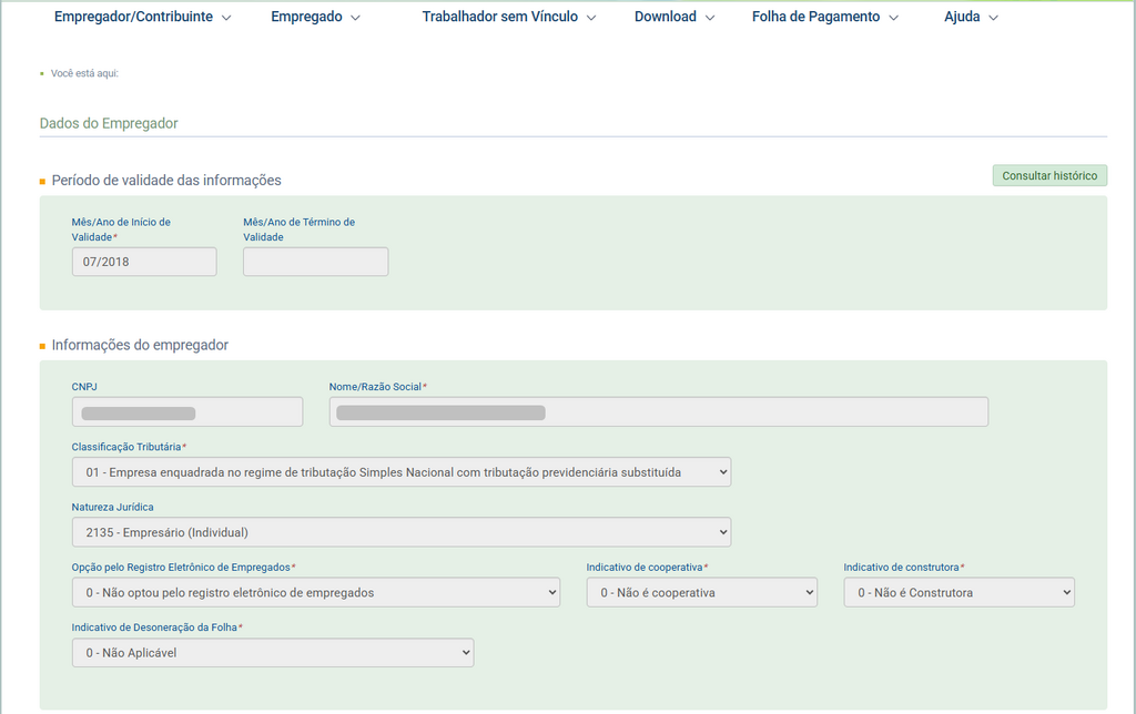 - Acesse a seção Dados do Empregador dentro do Portal do eSocial e, em seguida, clique no botão Consultar Histórico.