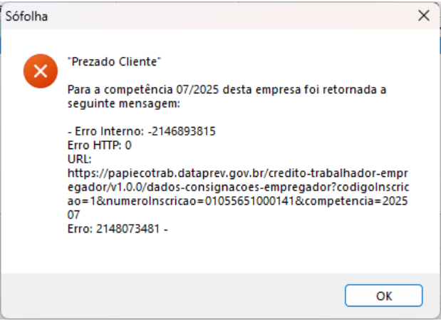 Esse erro está geralmente associado a falhas na comunicação segura (SSL/TLS) com os Webservices da Dataprev — órgão responsável por operacionalizar o sistema do Crédito do Trabalhador.