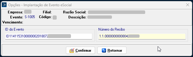 - Retorne no SFDPessoal, clique em cima do evento S-1005, em seguida em Opções > Implantação de eventos. Informe o ID e Número de recibo e confirme.