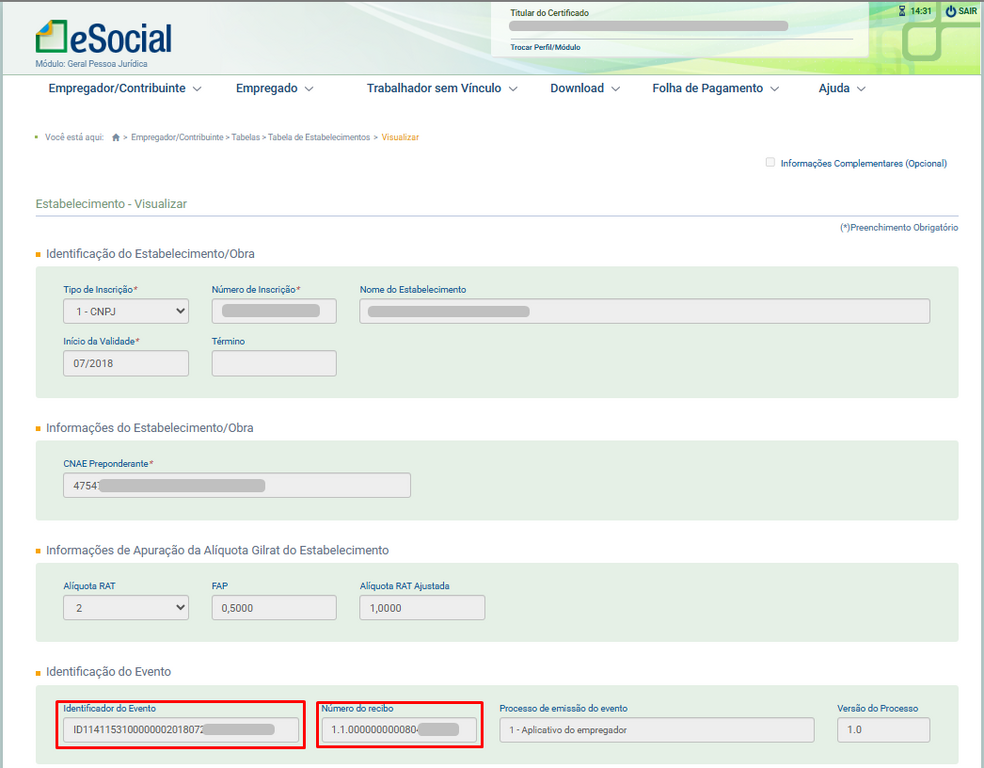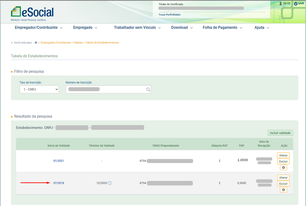 - Consulte pelo CNPJ ou CNO/ CEI do estabelecimento.