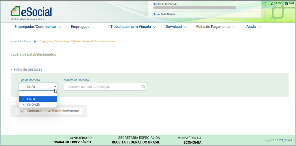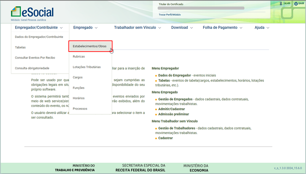 - Acesse o Portal do eSocial, e clique em Empregador/ Contribuinte > Tabelas> Estabelecimentos/ Obra