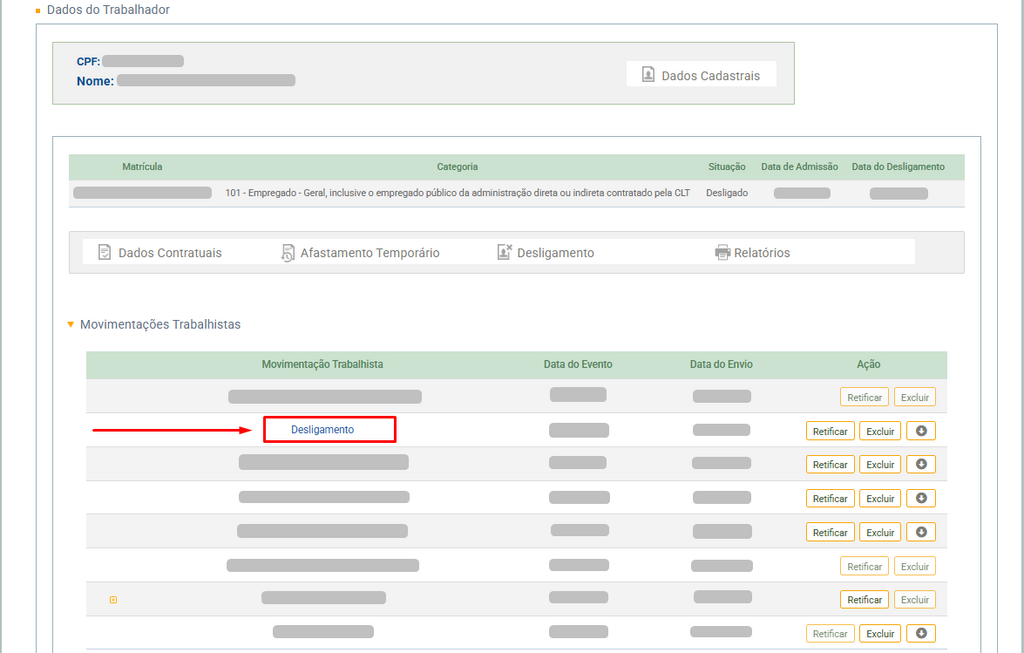 3. Selecione a opção Movimentações Trabalhistas e, em seguida, clique em Desligamento.