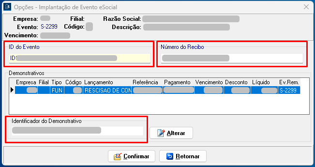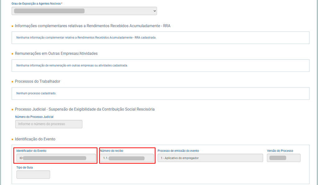 - Em seguida, preencha também os campos Identificador do Evento e Número do Recibo com os respectivos dados.