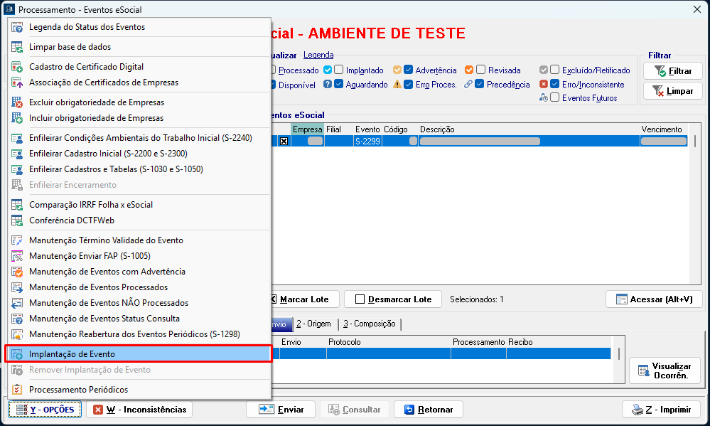 Localize o evento S-2299 e selecione: Opções > Implantação de Eventos.