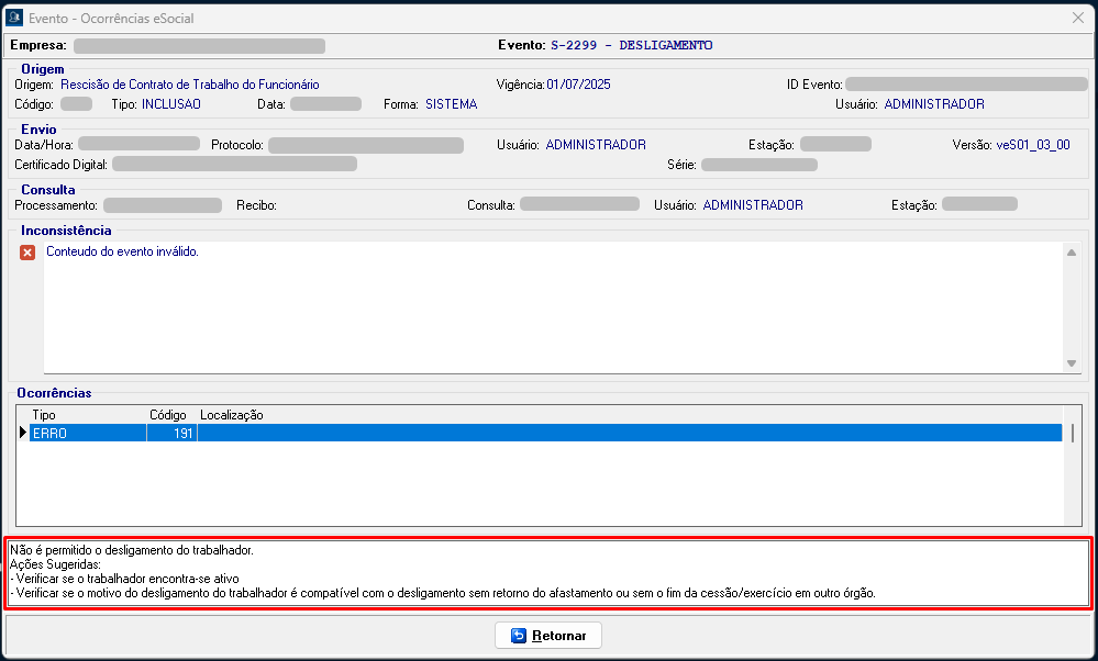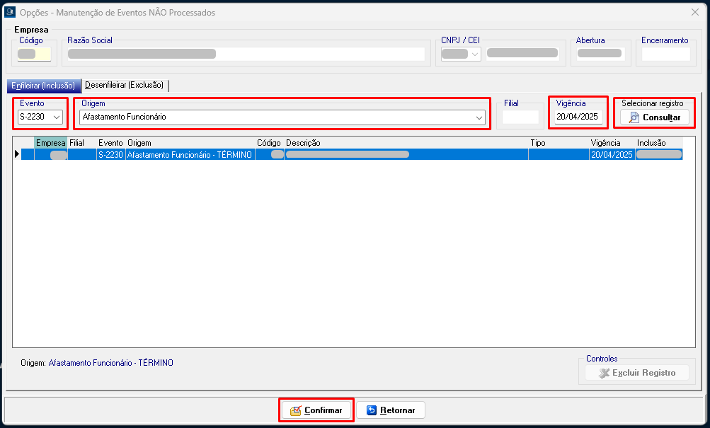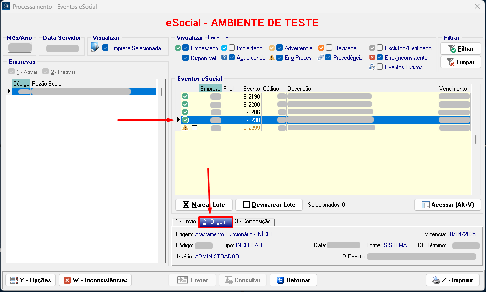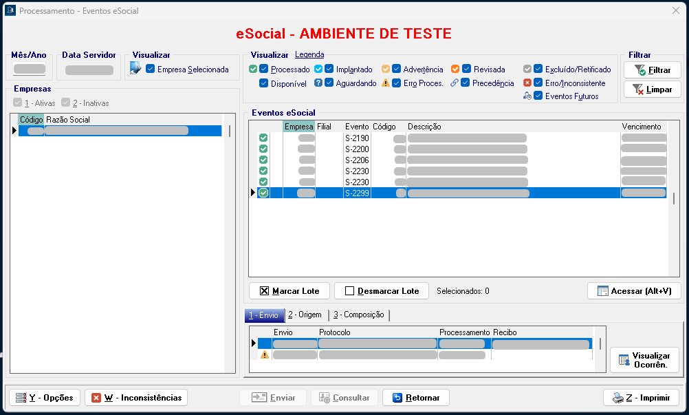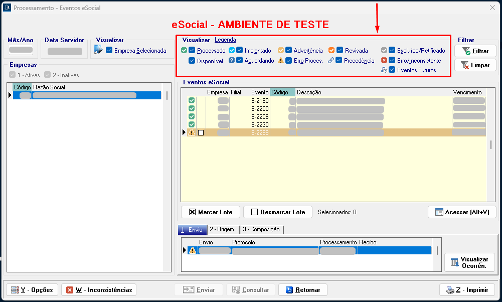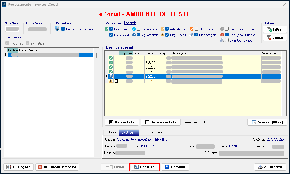 7. Marque o evento S-2299 novamente, envie e consulte. Desta forma o evento será processado.