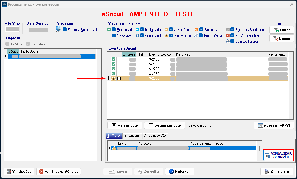 - Clique em cima do evento S-2299, e no botão Visualizar Ocorren.