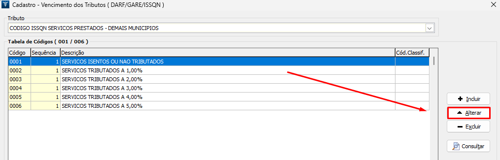 3. Ao selecionar a opção desejada, serão listados os códigos de serviço, selecione o desejado e clique na opção ALTERAR;