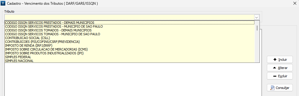 2. No campo Tributo, selecione "Código ISSQN Serviços Tomados - Demais Municípios ou Código ISSQN Serviços Prestados - Demais Municípios". (Conforme a operação desejada). Caso a empresa seja exclusivamente do município de São Paulo, utilize a opção Código ISSQN Serviços Tomados/Prestados - Município de São Paulo;