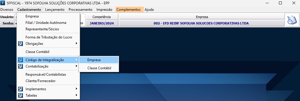 1. Na tela principal do sistema acesse o menu Cadastramento > Código de Integralização > Empresa e/ou Classe Contábil;