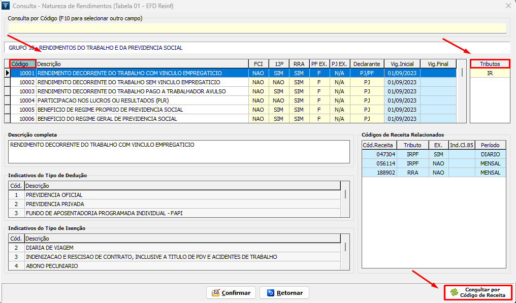 6. Será apresentada a Tabela abaixo, Código de Natureza de Rendimentos. A consulta pode ser efetuada pelo Código e/ou Descrição (clicando sobre cada palheta correspondente). Ao lado direito, observe a incidência dos tributos no código selecionado, e permanecendo dúvidas, no rodapé da tela, também é possível Consultar por Código de Receita;