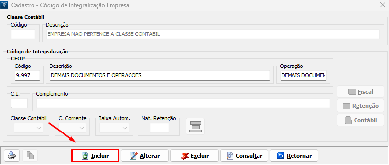 2. No campo Código, digite o CFOP desejado, clique em Consultar e selecione o C.I. que será utilizado;