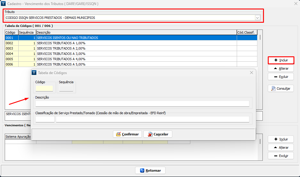 3. Clique em Incluir, informe o código do serviço/atividade e a descrição desejada, confirme;