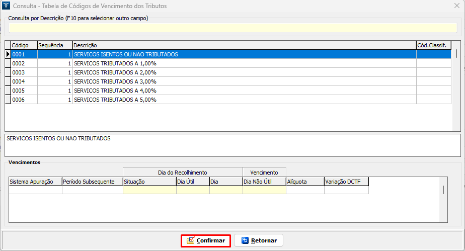 6. Na listagem apresentada, selecione o código de serviço cadastrado anteriormente, clique em Confirmar;