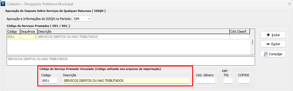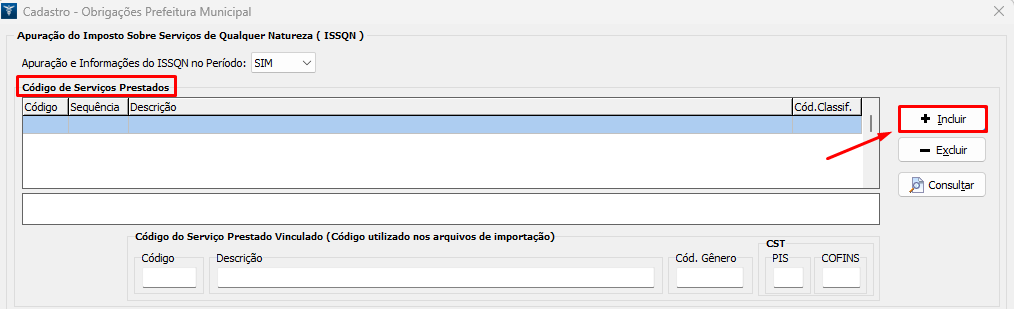 5. Na opção Código de Serviços Prestados, clique em Incluir ao lado direito;