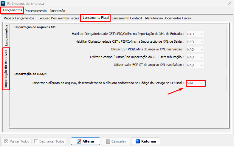 10. Ao acessá-la, verifique a opção Importação de ISSQN. Altere a tela e deixe SIM na opção "Importar a alíquota do arquivo, desconsiderando a alíquota cadastrada no Código do Serviço no SFFiscal;