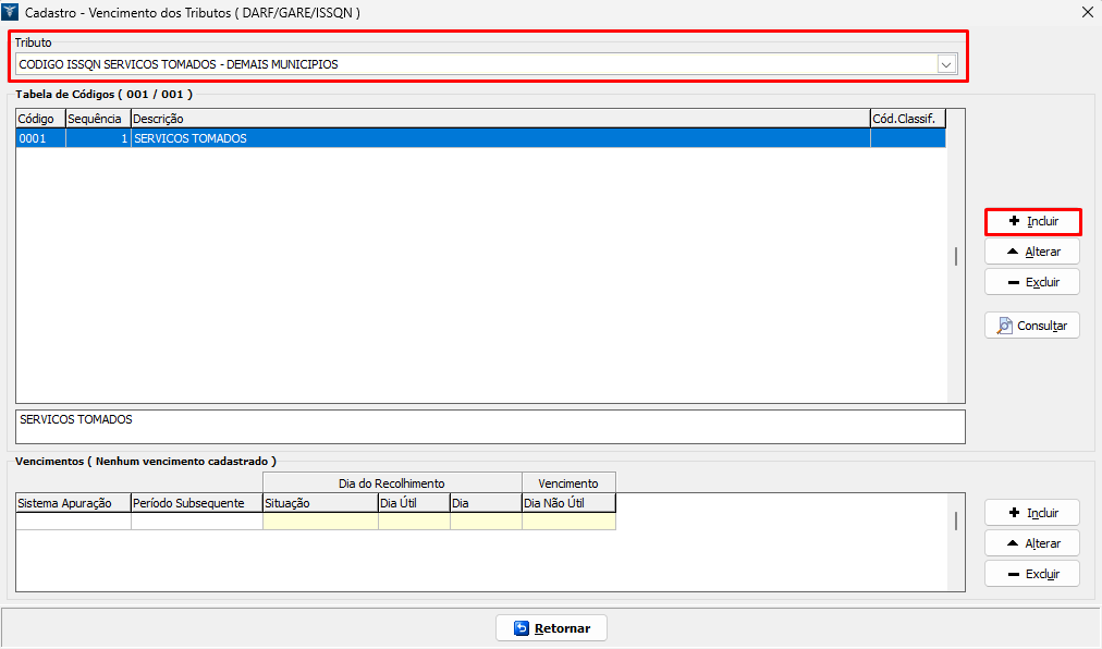 5. Na opção Código de Serviços Tomados, clique em Incluir ao lado direito;