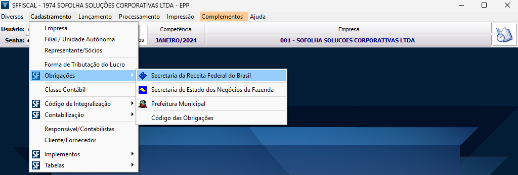1. Na tela inicial do sistema, na competência JANEIRO, acesse o menu Cadastramento > Obrigações > Secretaria da Receita Federal;