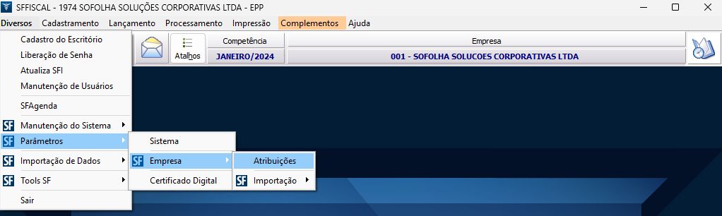 1. Na tela inicial do sistema, acesse o menu Diversos > Parâmetros > Empresa > Atribuições;
