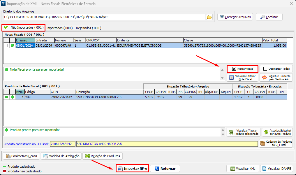 15. Sendo todas notas apresentadas para a importação, clique na opção Marcar Todas ao lado direito, e após Importar NF-e;