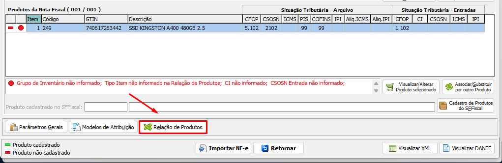 14. Confirme e retorne na tela principal, caso ocorram erros, estes serão apresentados abaixo do Produto da Nota Fiscal em vermelho.
