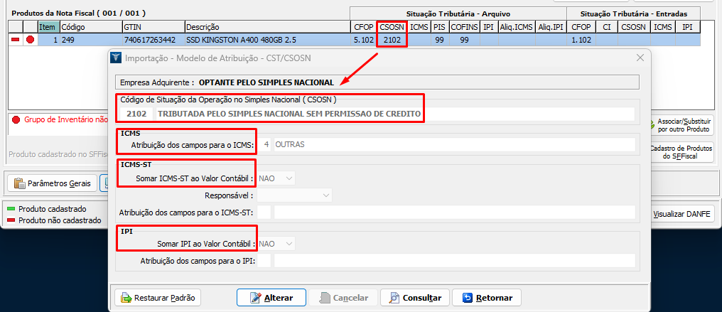 No exemplo, temos o CFOP de origem 5.102, que será importado/escriturado no CFOP Entrada 1.102;