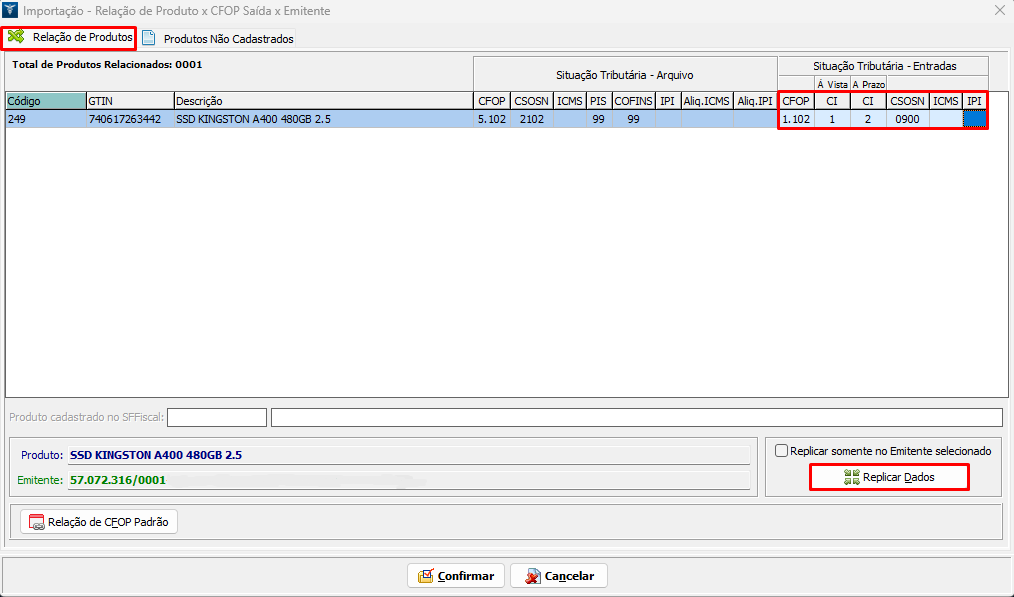 11. Ainda na palheta Relação de Produtos, para cada CFOP de Saída, é possível com a tecla F9 selecionar o CFOP de Entrada, C.I. a vista e prazo, CSOSN, CST, IPI (conforme o regime tributário e obrigatoriedade da empresa). Nesta tela, também é possível utilizar a opção Replicar Dados (função disponível para o mesmo CFOP de origem);