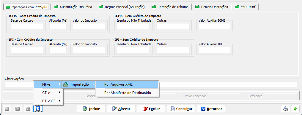 2. No rodapé da tela, ao lado esquerdo, clique em E > NF-e > Importação > Por arquivos XML;