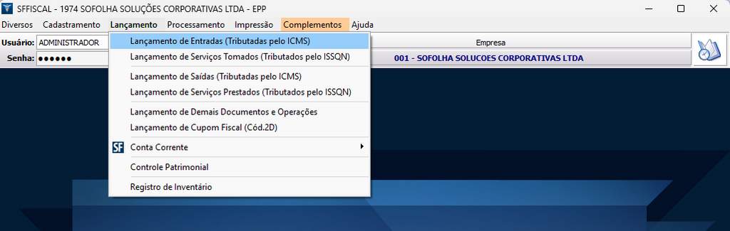 1. Na tela principal do sistema, acesse o menu Lançamento > Lançamento de Entradas;