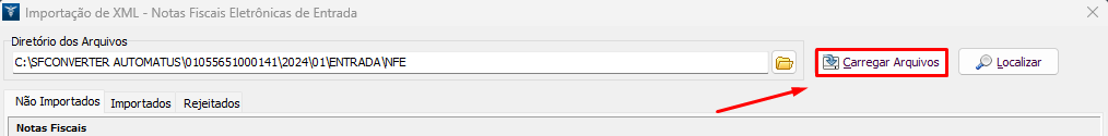3. Em Diretório dos Arquivos indique a pasta onde o arquivo XML está salvo, clicando em Selecionar pasta, logo após clique em Carregar Arquivos;