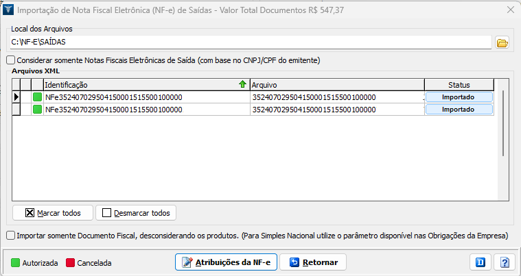 4. Os arquivos serão listados para a importação, clique em Marcar Todos, e após Atribuições da NF-e;