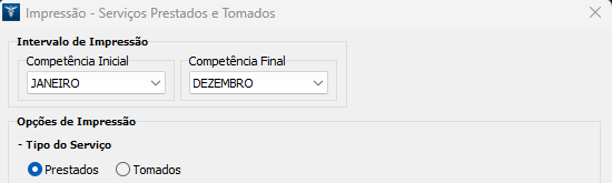 2. Em Intervalo de Impressão indique a competência desejada, selecionando o Tipo do Serviço desejado, Prestados ou Tomados;