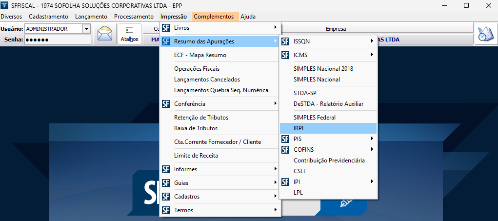 1. Na tela inicial do sistema, acesse o menu Impressão > Resumo das Apurações IRPJ e/ou CSLL. Também está disponível na contabilidade, para as empresas Lucro Real;