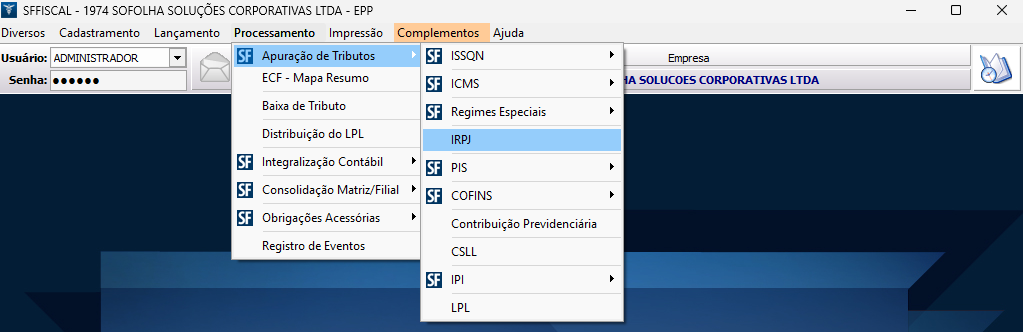 2. Ou acessando diretamente o menu Processamento > Apuração de Tributos > IRPJ e/ou CSLL;