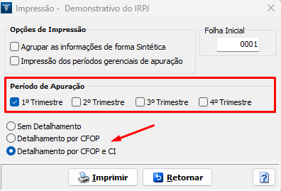 4. Em seguida, indique o Período de Apuração desejado. Poderá efetuar o Detalhamento por CFOP ou CFOP e CI, para otimizar a conferência e verificar a composição da apuração;
