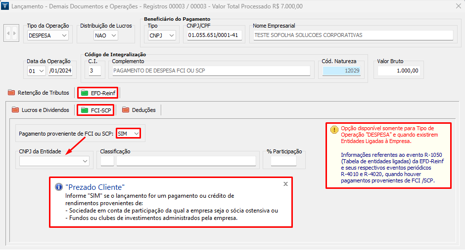 5. Após o processamento do evento R-1050 concluído, o cadastro correspondente às entidades poderá ser vinculado ao lançamento de Demais Documentos, conforme o exemplo: