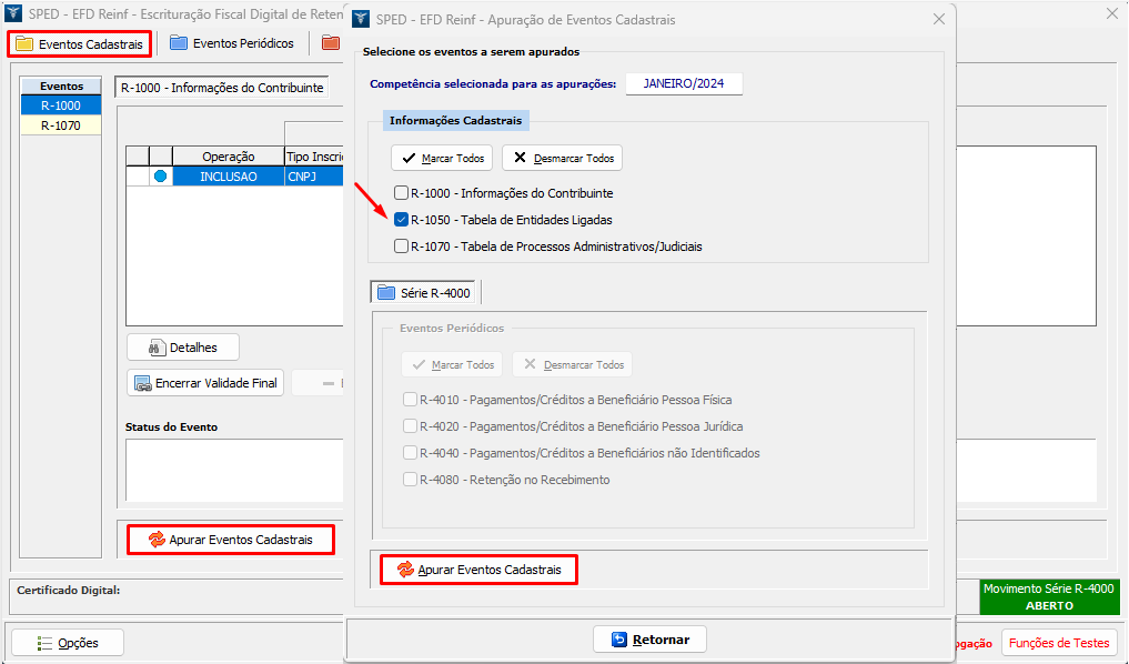 3. Na aba Eventos Cadastrais, clique em Apurar Eventos Cadastrais. Selecione o evento R-1050 e clique em Apurar Eventos Cadastrais;
