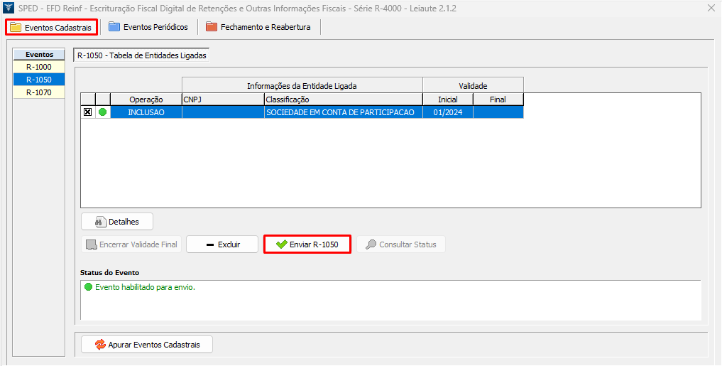 4. O evento será habilitado e poderá ser enviado clicando na opção Enviar R-1050;