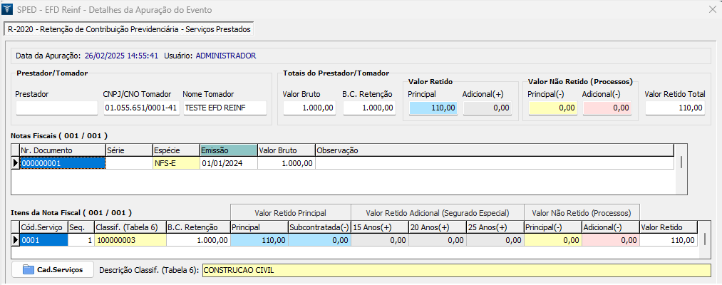 5. Na palheta EFD Reinf, existem as subpastas Retenção INSS e Outros, utilize-as no caso de Retenção de Subcontratada e/ou Prestação de serviço em obra de Construção Civil;