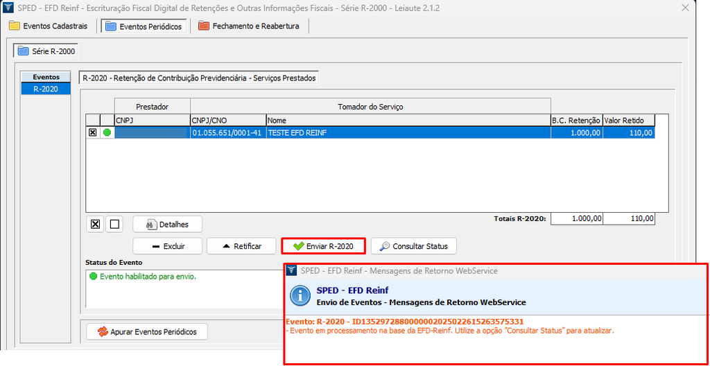 10. Retorne, selecione o evento e clique na opção Enviar R-2020. O Evento ficará em processamento na base da EFD Reinf;