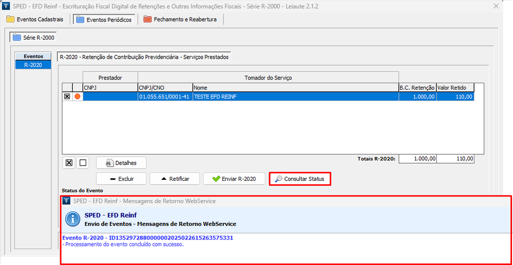 11. Na tela seguinte, selecione o evento novamente, clicando na opção Consultar Status. Após esta consulta, caso não sejam apresentados erros, o processamento do evento será concluído com sucesso.
