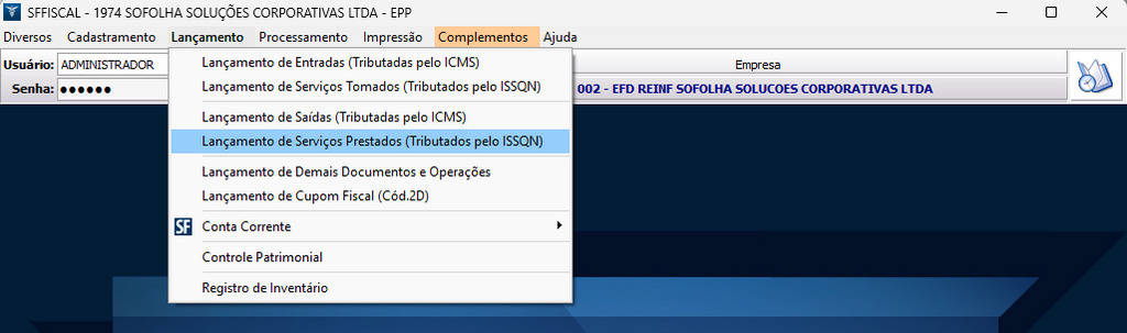 3. Na tela principal do sistema, acesse o menu Lançamento > Lançamento de Serviços Prestados;