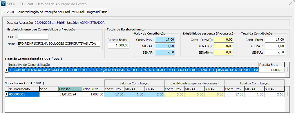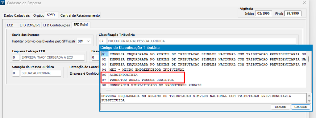 Para gerar o registro R-2050, a Classificação Tributária da empresa  corresponderá à opção 06 Agroindústria ou 07 Produtor Rural Pessoa Jurídica;