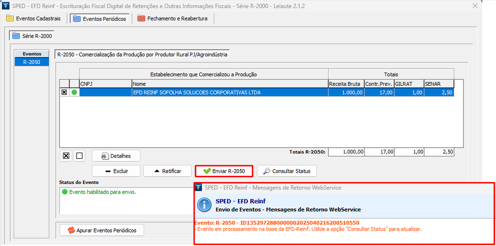 7. Retorne, selecione o evento e clique na opção Enviar R-2050. O Evento ficará em processamento na base da EFD Reinf;