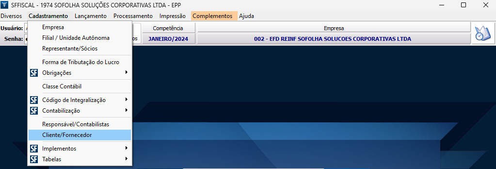 1. Na tela inicial do sistema, acesse o menu Cadastramento > Cliente/Fornecedor;